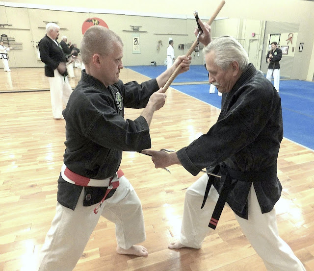 | O'Sensei Bill Borea (RIP) blocks bo attack by Dr. Adam with sai during bunkai training in kobudo class at the Arizona Hombu Karate dojo. |